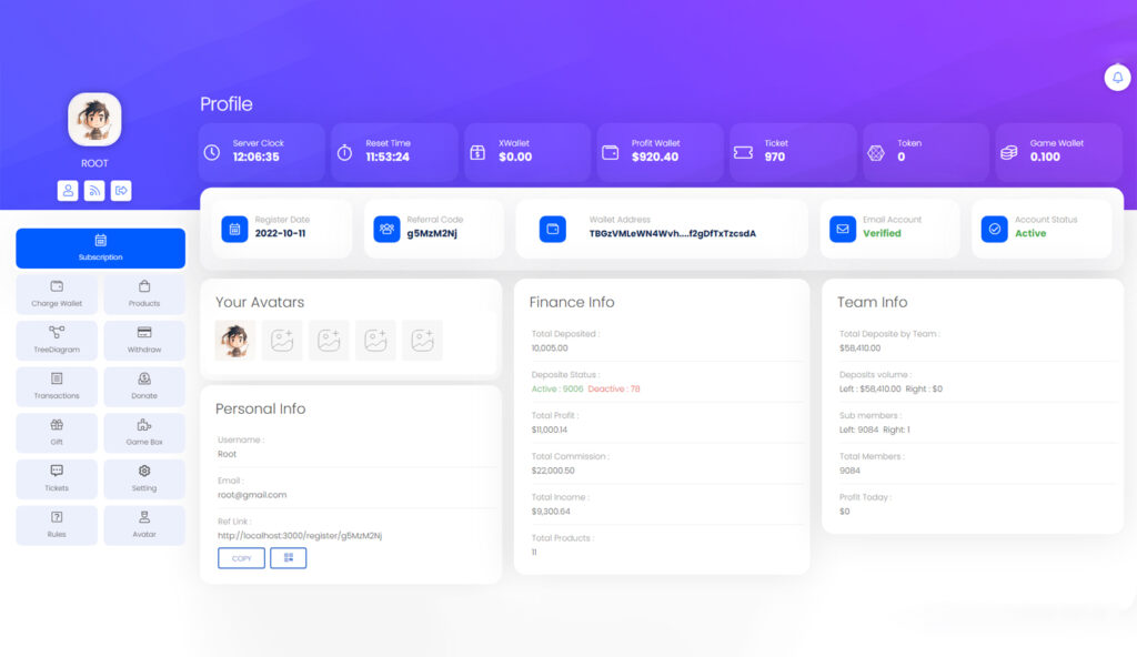 We developed a fully automated MLM investment platform that supports both binary and uni-level models. The system handles daily flush processing, calculates and distributes daily and monthly profits, and seamlessly integrates crypto recharge and withdrawal options — all through a user-friendly dashboard.